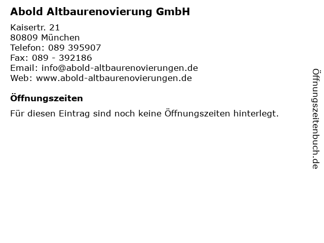 | Öffnungszeiten Abold Altbaurenovierung GmbH in München anzeigen | |