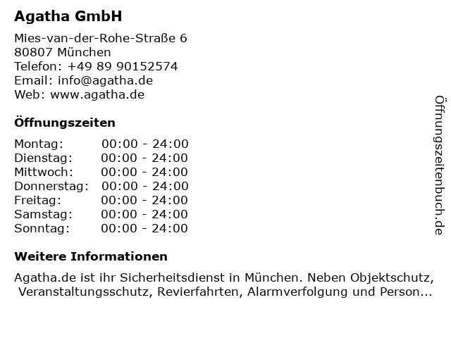 | Öffnungszeiten Agatha GmbH in München anzeigen | |