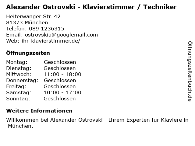 Branchen & Suchbegriffe zu Alexander Ostrovski - Klavierstimmer / Techniker:alexander, geschäft für musikinstrumente und -zubehör, klavierreparaturen, klavierstimmer, ostrovski, techniker, wartung und reparatur von musikinstrumenten |