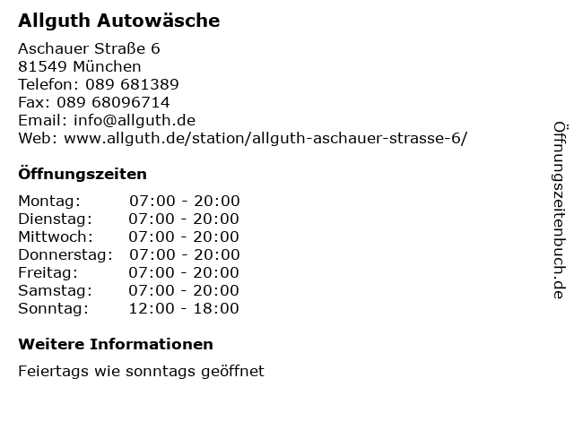 | Öffnungszeiten Allguth Autowäsche in München anzeigen | |