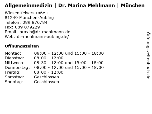 1 Dr.med. Marina Mehlmann Fachärztin f. Allgemeinmedizin (Entfernung: 0,00 km) Wiesentfelser Str. 1, 81249 München 2 Kadner Raimund u. Marina Logistikberatung (Entfernung: 2,70 km) Rottenbucher Str. 49, 82166 Gräfelfing 3 Marina Wilbs Kosmetikstudio, Michael MalerBed. (Entfernung: 2,70 km) Planegger Str. 24 A, 81241 München 6 |