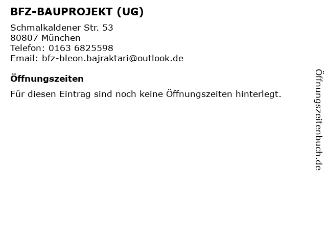 | Öffnungszeiten BFZ-BAUPROJEKT (UG) in München anzeigen | |
