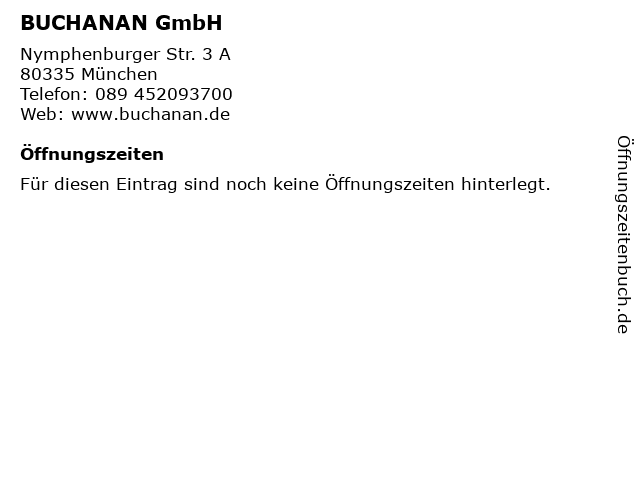 | Öffnungszeiten BUCHANAN GmbH in München anzeigen | |