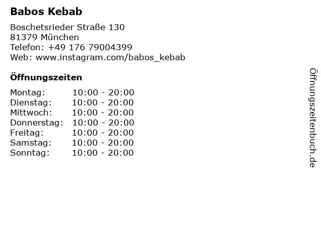 | Öffnungszeiten Babos Kebab in München anzeigen | |