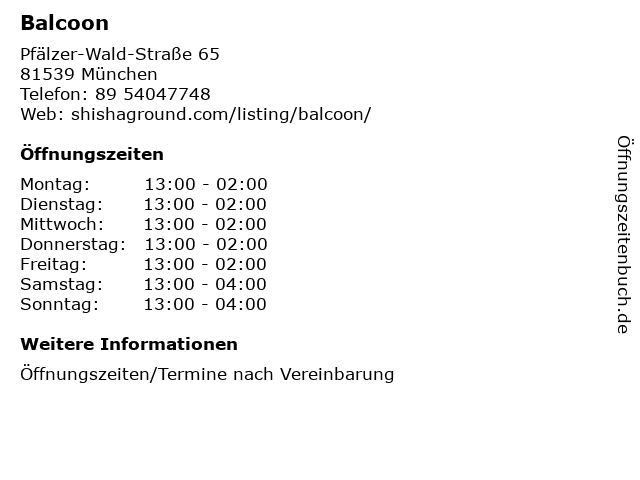 | Öffnungszeiten Balcoon in München anzeigen | |