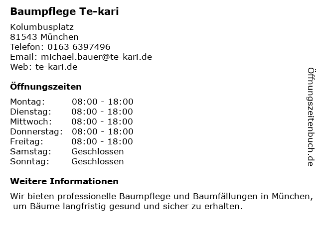 | Öffnungszeiten Baumpflege Te-kari in München anzeigen | |