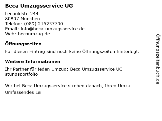 | Öffnungszeiten Beca Umzugsservice UG in München anzeigen | |