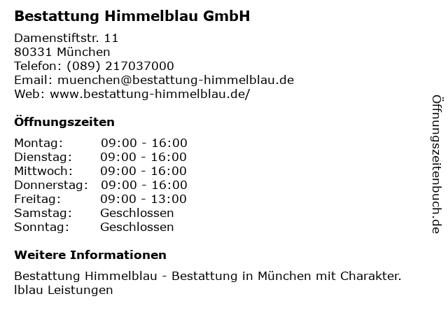| Öffnungszeiten Bestattung Himmelblau GmbH in München anzeigen | |