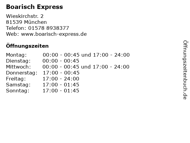 | Öffnungszeiten Boarisch Express in München anzeigen | |