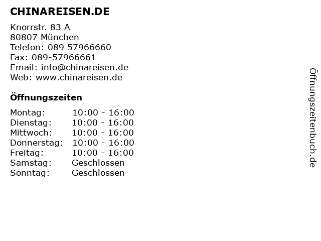 | Öffnungszeiten CHINAREISEN.DE in München anzeigen | |