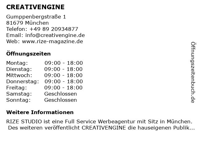 | Öffnungszeiten CREATIVENGINE in München anzeigen | |