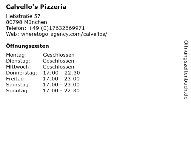 | Öffnungszeiten Calvello's Pizzeria in München anzeigen | |