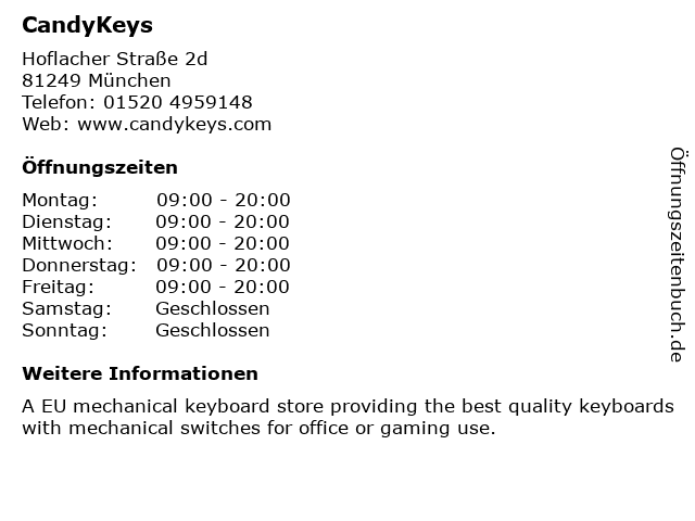 | Öffnungszeiten CandyKeys in München anzeigen | |