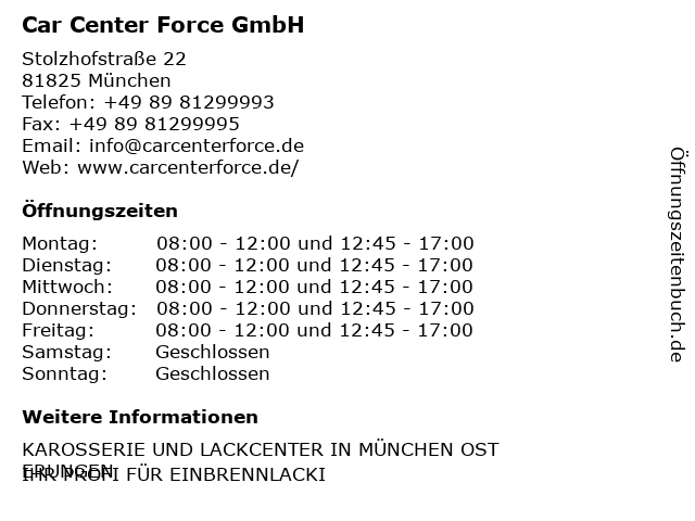 | Öffnungszeiten Car Center Force GmbH in München anzeigen | |