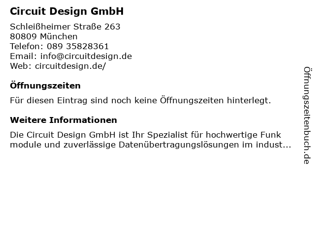 | Öffnungszeiten Circuit Design GmbH in München anzeigen | |