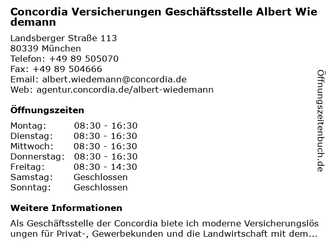 Branchen & Suchbegriffe zu Concordia Versicherungen Geschäftsstelle Albert Wiedemann:albert, concordia, geschäftsstelle, versicherungen, versicherungsagentur, wiedemann |