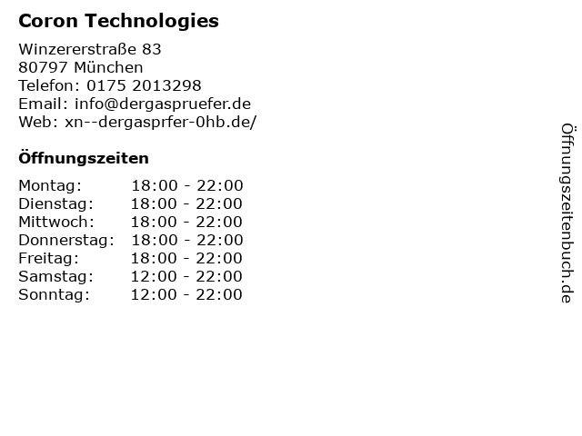 | Öffnungszeiten Coron Technologies in München anzeigen | |