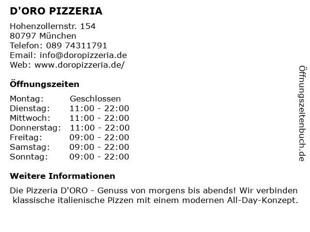 | Öffnungszeiten D'ORO PIZZERIA in München anzeigen | |