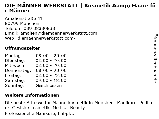 1 DIE MÄNNER WERKSTATT | Kosmetik & Haare für Männer (Entfernung: 1,63 km) Wilhelmstraße 32, 80801 München 5 waxing lounge münchen / prof. sugaring für männer & frauen (Entfernung: 2,04 km) Reichenbachstraße 31, 80469 München 6 |