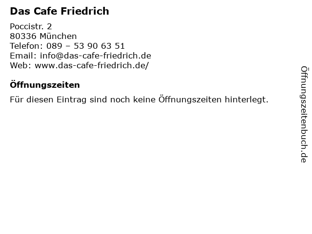 | Öffnungszeiten Das Cafe Friedrich in München anzeigen | |
