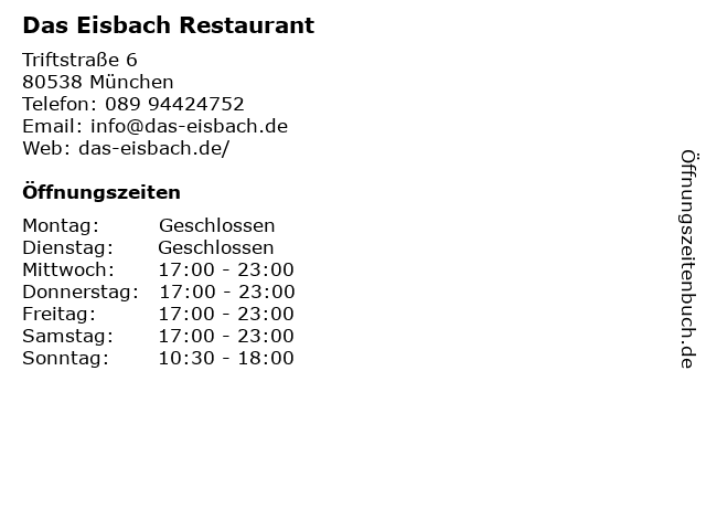 | Öffnungszeiten Das Eisbach Restaurant in München anzeigen | |