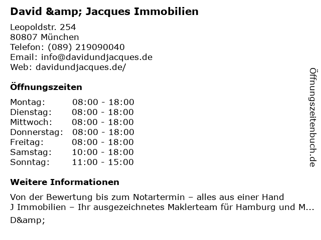 | Öffnungszeiten David & Jacques Immobilien in München anzeigen | |