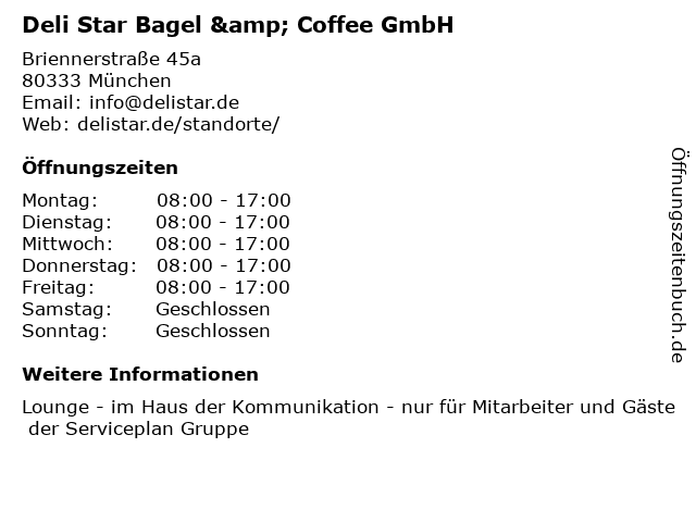 | Öffnungszeiten Deli Star Bagel & Coffee GmbH in München anzeigen | |