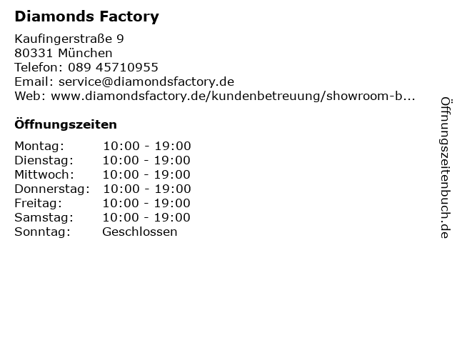 | Öffnungszeiten Diamonds Factory in München anzeigen | |