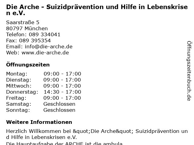 Branchen & Suchbegriffe zu Die Arche - Suizidprävention und Hilfe in Lebenskrisen e.V.:arche, beratungsstelle, e.v., familienberatung, hilfe, lebenskrisen, suizidprävention |