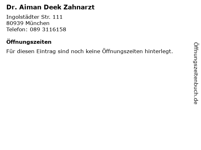 | Telefonnummer Dr. Aiman Deek Zahnarzt in München (089 3116158) anrufen | |