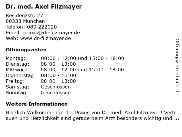 | Öffnungszeiten Dr. med. Axel Filzmayer in München anzeigen | |
