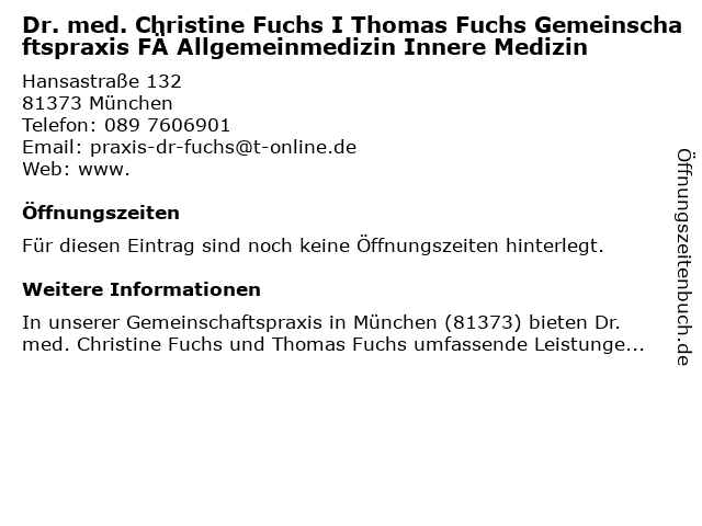 | Dr. med. Christine Fuchs I Thomas Fuchs Gemeinschaftspraxis FÄ Allgemeinmedizin Innere Medizin anrufen | |