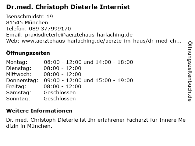 1 Dr. med. Christoph Matt & Kollegen - Internistische Gemeinschaftspraxis (Entfernung: 0,01 km) Isenschmidstraße 19, 81545 München 2 Christoph Dieterle Facharzt für Innere Medizin (Entfernung: 0,01 km) Isenschmidstr. 19, 81545 München 6 Christoph Seitz Facharzt für Innere Medizin Endokrinologie u. Diabetologie (Entfernung: 3,05 km) Diefenbachstr. 38, 81479 München |