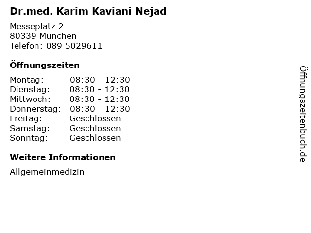 | Öffnungszeiten Dr.med. Karim Kaviani Nejad in München anzeigen | |