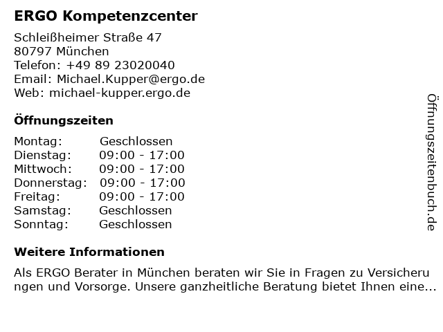 | Öffnungszeiten ERGO Kompetenzcenter in München anzeigen | |
