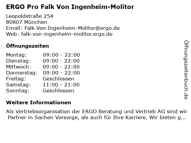 | Öffnungszeiten ERGO Pro Falk Von Ingenheim-Molitor in München anzeigen | |
