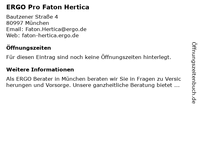 | Öffnungszeiten ERGO Pro Faton Hertica in München anzeigen | |