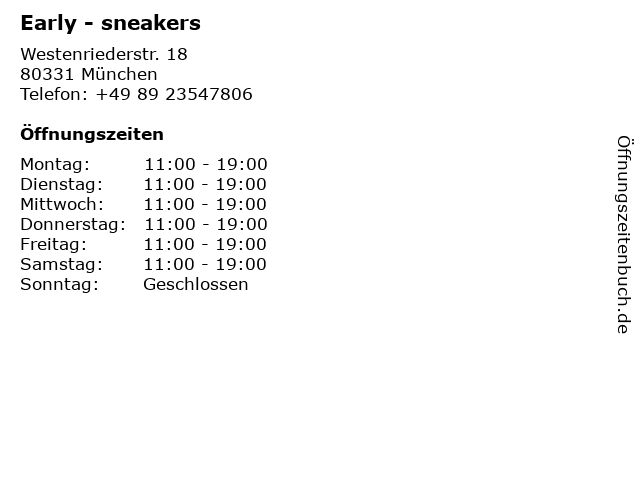 | Öffnungszeiten Early - sneakers in München anzeigen | |