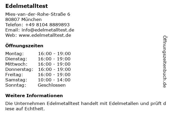 | Öffnungszeiten Edelmetalltest in München anzeigen | |