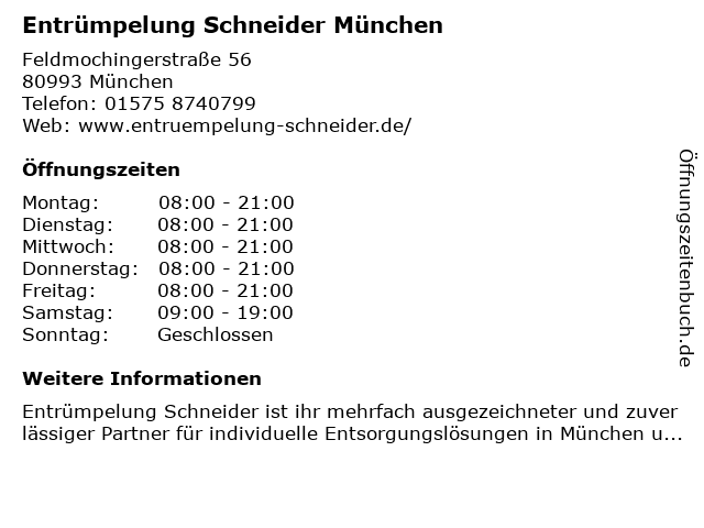 1 4 Entrümpelung in und um München - für Privat & Gewerbe - für Mieter und Eigentümer! (Entfernung: 1,39 km) Hollerstr. 2, 80995 München 5 AID Dienstleistungen Umzugsunternehmen Entrümpelung und Umzugsservice (Entfernung: 3,30 km) Josef-Führer-Str. 38, 80997 München 6 |
