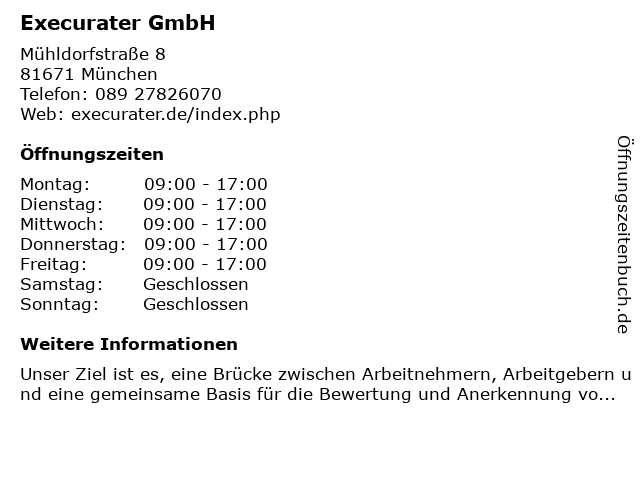 | Öffnungszeiten Execurater GmbH in München anzeigen | |