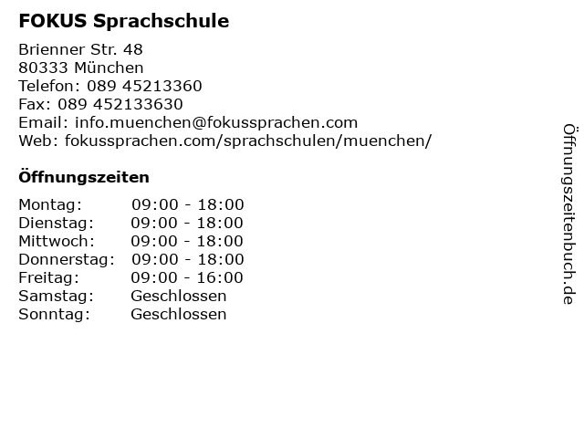 | Öffnungszeiten FOKUS Sprachschule in München anzeigen | |