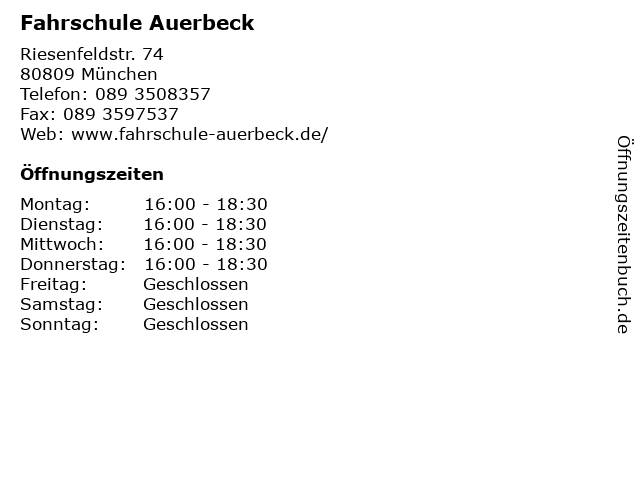 | Öffnungszeiten Fahrschule Auerbeck in München anzeigen | |