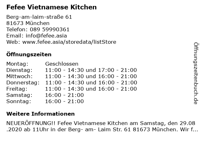 | Öffnungszeiten Fefee Vietnamese Kitchen in München anzeigen | |