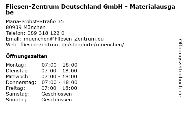 1 Fliesen-Zentrum Deutschland GmbH - Showroom (Entfernung: 0,04 km) Maria-Probst-Straße 35, 80939 München 4 Fliesen- und Natursteinverlegung München Ldt. (Entfernung: 2,75 km) Milbertshofener Str 11, 80807 München 6 Marcus Heinicke Fliesen Ausübung des zulassungsfreien Fliesen- Platten- und (Entfernung: 6,58 km) Eggenfeldener Str. 64, 81929 München |