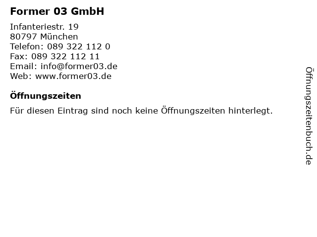 | Öffnungszeiten Former 03 GmbH in München anzeigen | |