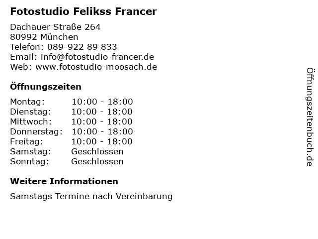 | Öffnungszeiten Fotostudio Felikss Francer in München anzeigen | |