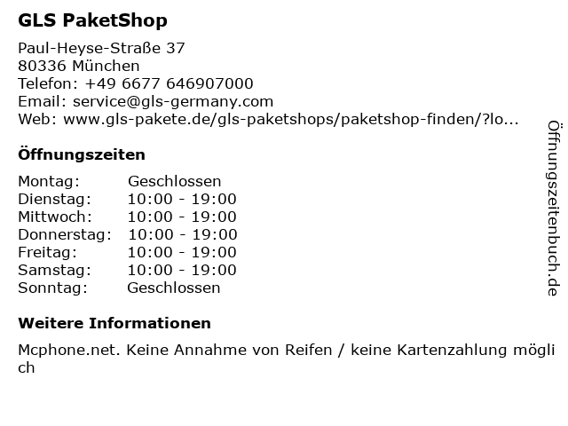 | Öffnungszeiten GLS PaketShop in München anzeigen | |
