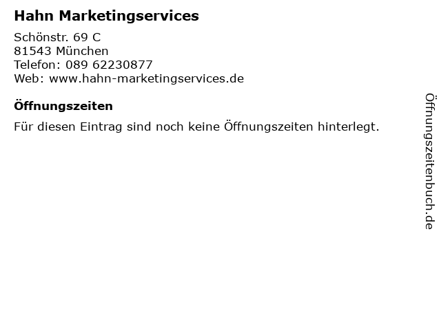 | Öffnungszeiten Hahn Marketingservices in München anzeigen | |