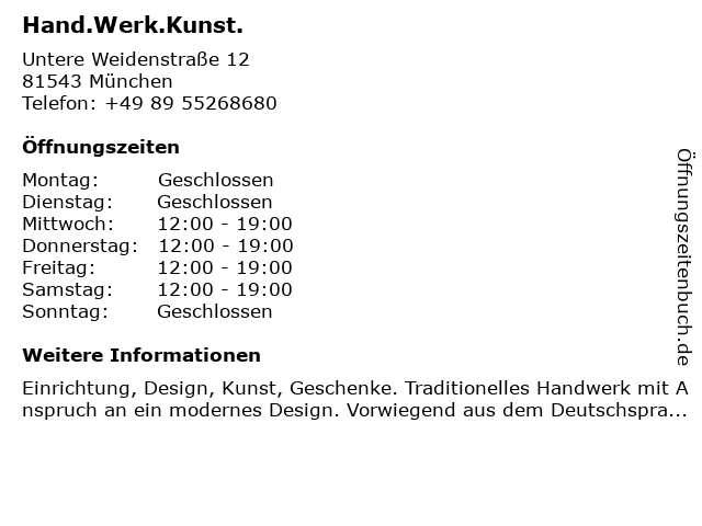 | Öffnungszeiten Hand.Werk.Kunst. in München anzeigen | |